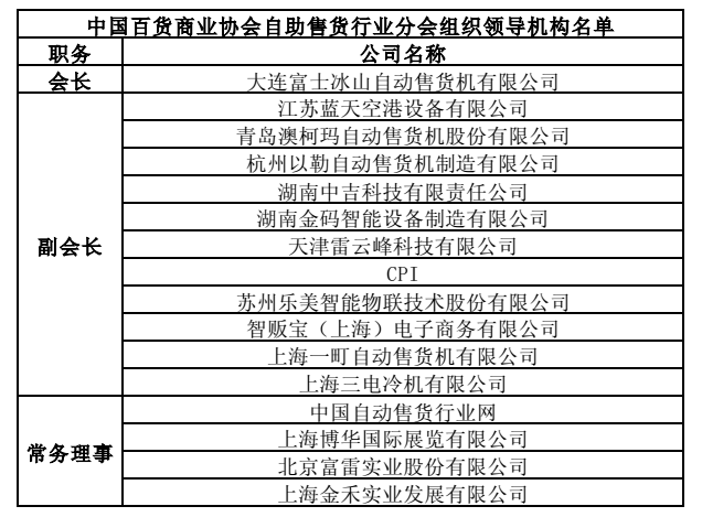 附:中國百貨商業(yè)協(xié)會(huì)自助售貨行業(yè)分會(huì)組織領(lǐng)導(dǎo)機(jī)構(gòu)名單