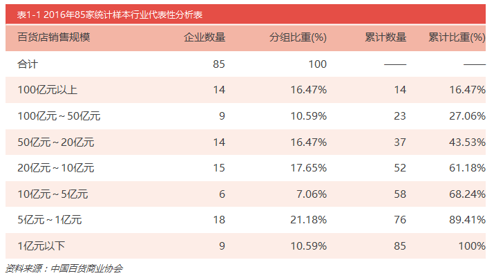 中國(guó)百貨商業(yè)協(xié)會(huì)采集匯總了部分(85家)會(huì)員單位的銷售統(tǒng)計(jì)數(shù)據(jù),對(duì)2016年行業(yè)情況作了初步的統(tǒng)計(jì) 分析。統(tǒng)計(jì)樣本中的85家會(huì)員單位絕大多數(shù)是中國(guó)百貨零售行業(yè)的骨干企業(yè),年銷售額規(guī)模在億元以上的企 業(yè)(集團(tuán))占89.41%,超過10億元的占61.18%,超過100億元的占16.47%。從銷售額占比看,樣本中52 家超10億元企業(yè)(集團(tuán))的市場(chǎng)規(guī)模占樣本整體銷售額的98.55%,14家超100億元企業(yè)的市場(chǎng)規(guī)模占整體 規(guī)模的79.31%。這些企業(yè)的經(jīng)營(yíng)狀況可以基本反映年度行業(yè)運(yùn)行實(shí)際情況,該項(xiàng)統(tǒng)計(jì)具有行業(yè)典型代表性(見表1-1)。