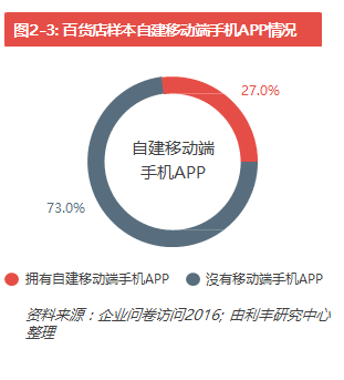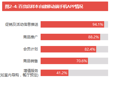 此外,27.0%的受訪百貨企業(yè)擁有自建移動(dòng)端手機(jī)APP(見圖2-3)。他們主要通過手機(jī)APP進(jìn)行促銷信息推送,商品銷售,為消費(fèi)者提供如室內(nèi)導(dǎo)購(gòu),餐廳預(yù)定等附加服務(wù)(見圖2-4)。