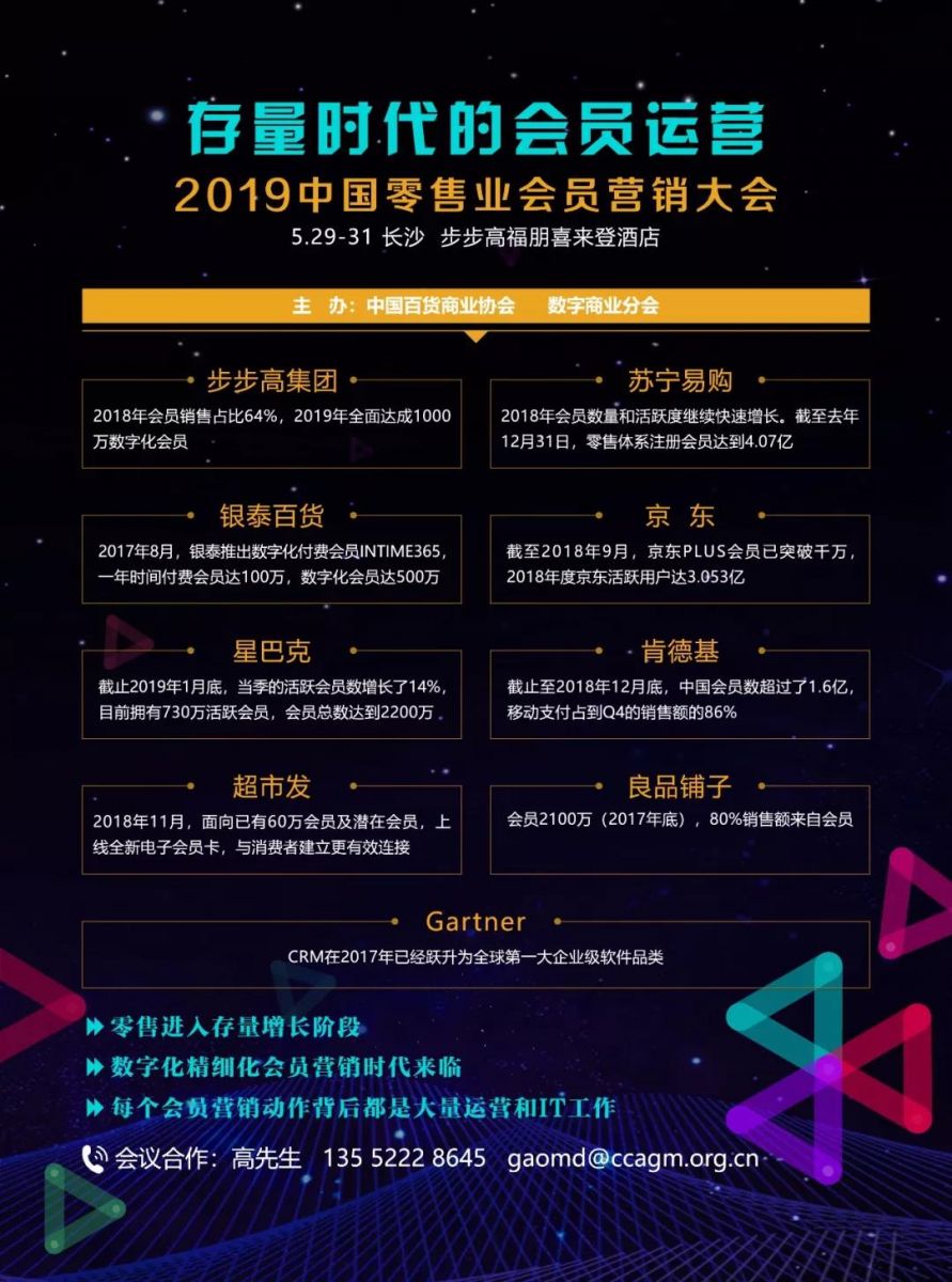 為了分享交流會員營銷工作,探討營銷活動表象背面大量的運營和IT技術工作,中國百貨商業協會定于5.29-31日在長沙步步高福朋喜來登酒店,召開“2019中國零售業會員營銷大會”,主題為“存量時代的會員運營”。