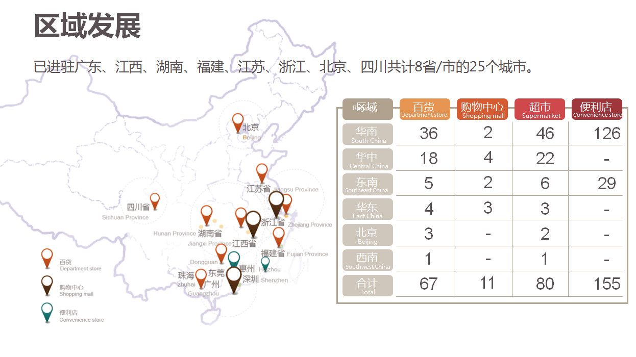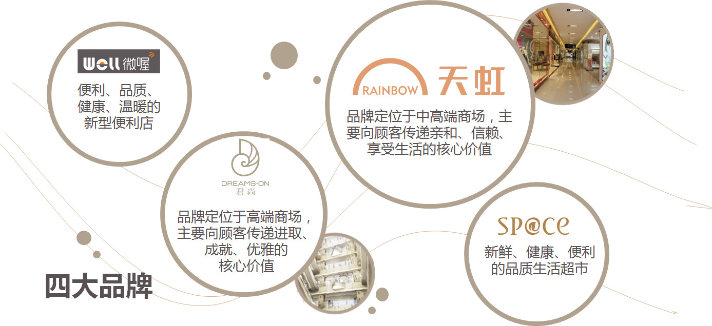 我們品牌有四個品牌,一個是天虹的便利店叫做微喔便利店,一個是天虹本身,面向中高端客戶,服務(wù)中產(chǎn)階級的家庭購物,我們有一個高端品牌叫君尚,比我們天虹本身更高的定位,還有一個超市,天虹在發(fā)展獨立超市的業(yè)態(tài)取的名字叫做space,我們天虹有八個省25個城市,天虹購物中心有四種業(yè)態(tài)。