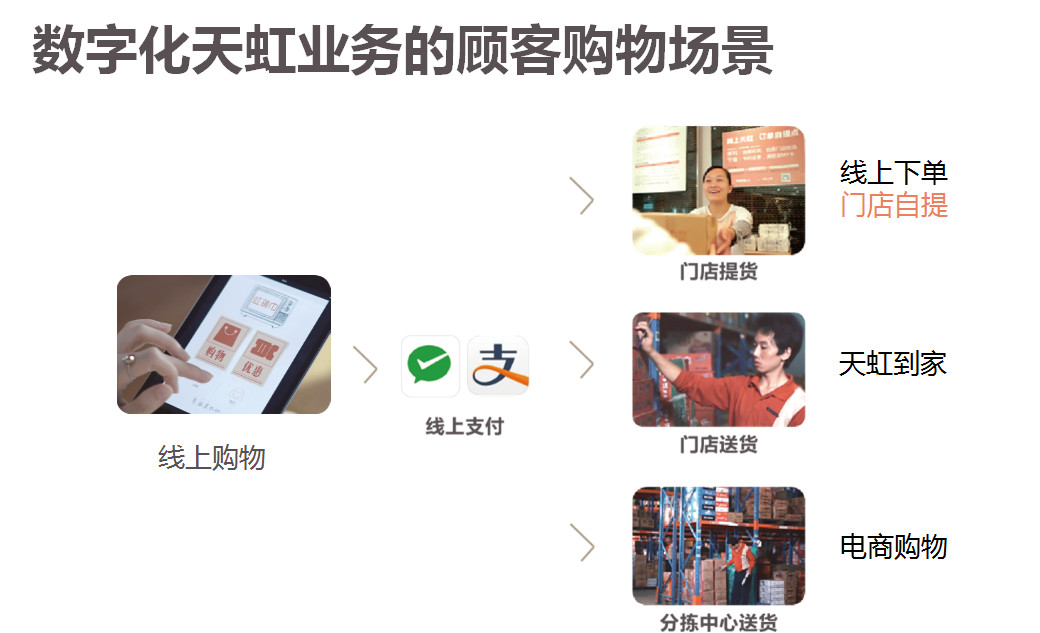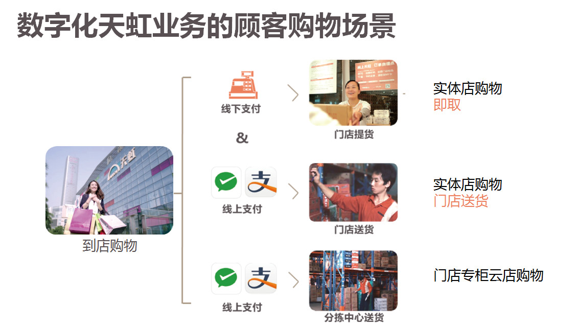 數(shù)字化就是說我們構(gòu)建了新的購物場景,如果顧客到店里消費的話,我們可以由幾種支付方式,現(xiàn)在我們天虹96%到98%已經(jīng)實現(xiàn)了專柜會員端直接收銀,超市也完成了自助收銀和手機(jī)收銀,顧客也可以到店馬上拿走,實體店也可以送貨,同時我們百貨商店的云店也可以為顧客提供服務(wù)。就是滿足顧客在不同的場景下的利用線上紅領(lǐng)巾的平臺實現(xiàn)顧客各種場景下的服務(wù)。