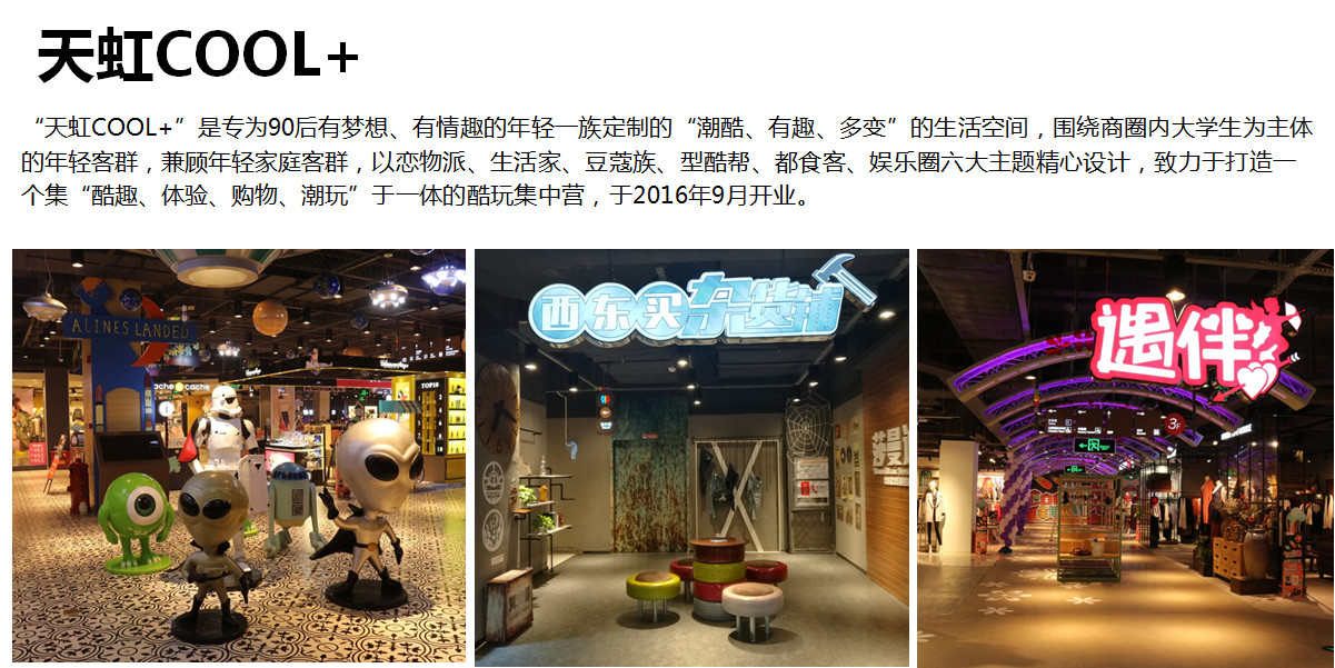 重點講一下這個案例,我們在南昌城市邊緣開了一家COOL+,這家店非常特殊,周圍沒有什么居民社區(qū),有七所大學(xué)的市場,當(dāng)時我們在天虹很少做這樣定位的市場,我們基本上圍繞社區(qū)或者城市中心店,三公里范圍內(nèi)有幾十萬人的中產(chǎn)階級消費的家庭實體,這個店比較特殊,是一個大學(xué)生群體,基于這樣市場怎么做好精準(zhǔn)定位,這個過程中即使是一個嘗試,也是在這個過程中讓我們看到了精準(zhǔn)定位來實現(xiàn)百貨好的業(yè)績非常重要的關(guān)鍵,針對大學(xué)生的特點我們是為大學(xué)生特殊定制的一個商場,從設(shè)計的空間上,到品類的布局上,到提供的商品上,我們圍繞著大學(xué)生,包括我們把大學(xué)生分成一些生活派、戀物派,我們是基于這樣一些主題打造了不同的街區(qū),吃喝玩樂購的街區(qū),這個商場里面我們的零售比例比原來的百貨減少了,我們這個商場大概零售比例占了50%。更多做了一些體驗消費,我們考慮大學(xué)生其實是要喜歡聚、喜歡玩,同時我們在參與COOL+的名字也是大學(xué)生一起起的名字,我們選擇一個品類的時候,我們花了很多心思,比方我們選擇一家網(wǎng)吧,是篩選了200家網(wǎng)吧,找了四家有可能跟大學(xué)生匹配的網(wǎng)吧,由大學(xué)生一起參與,最后我們選定一家網(wǎng)吧,網(wǎng)吧有很多不是所有都是大學(xué)生喜歡的網(wǎng)吧,所以我們是這樣去打造這樣一個類別。