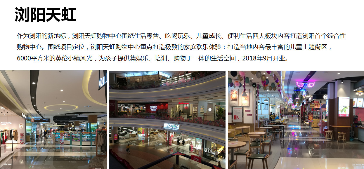 這是我們2018年9月份開的一個在縣級城市的商城——瀏陽商場,一開就非常火爆,成為瀏陽新的一個地標(biāo),面積其實不會很大,但是在這樣一些四線城市、三線城市位置上,我們打造吃喝玩樂購,把我們兒童成長,生活零售體驗的模式,打造了一個小型的購物中心。在這樣一個業(yè)態(tài)情況下,我們認(rèn)為在四線城市還是有非常好的生命力,因為我們的實踐已經(jīng)證明了,包括我們打造了兒童的英倫小鎮(zhèn),我們從孩子的教育、娛樂、購物一體做了一個非常好的組合,也就是說我們現(xiàn)在探索出來在四線城市的小型購物中心滿足城市的購物需求上,我們找到了一些方法。