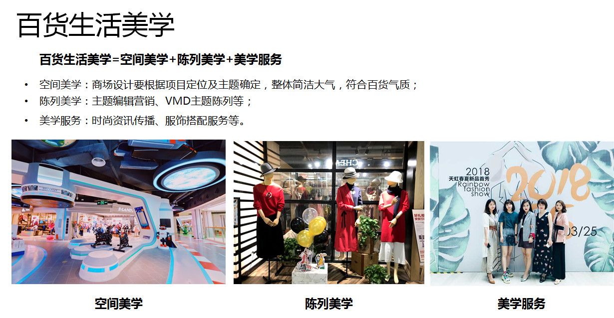 在生活美學(xué),因為天虹百貨是我們主要的業(yè)態(tài),我們在百貨上強(qiáng)調(diào)打造生活美學(xué),包括三個方面,一個是空間美學(xué),一個是陳列美學(xué),一個是美學(xué)服務(wù)。在這個部分天虹大概已經(jīng)花了兩三年的時間,我們也有我們專門的手冊和為消費者專門打造的一些沙龍服務(wù),這個方面也為顧客不是搭配專業(yè)服務(wù)方面收到一個比較好的效果。