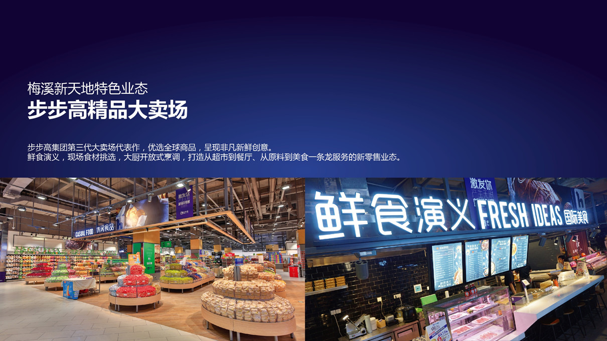 是步步高集團第三代大賣場的代表作,優選全球商品,呈現新鮮創意。鮮食演義、現場食材挑選、大廚開放式烹調,打造從超市到餐廳、從原料到美食一條龍服務的新零售業態。