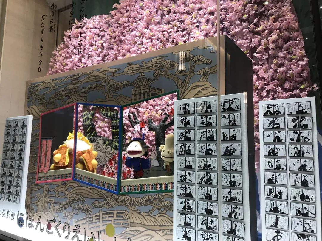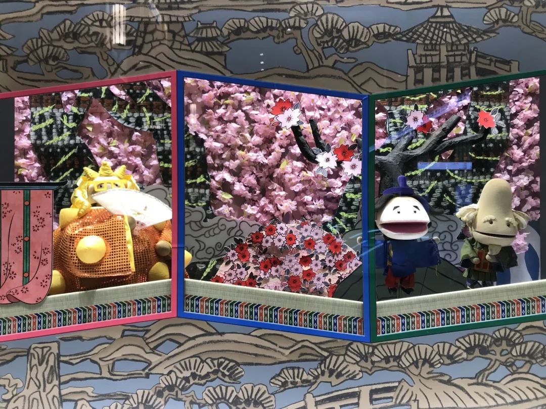 櫥窗再現(xiàn)了被稱為“太夫”的人一邊講著故事、一邊彈著三味線的情景,三位人偶師操縱著一個人偶,用人偶凈琉璃文樂的形式表演繞口令。