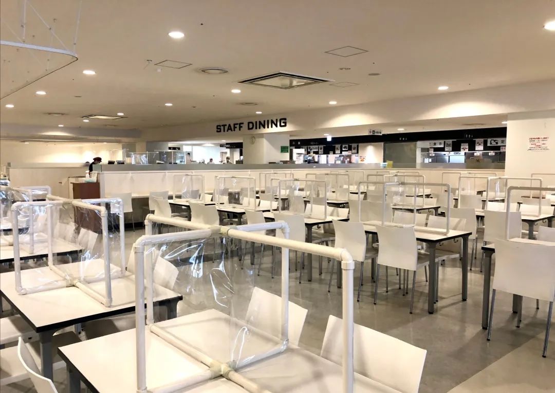 員工出入乘坐的專用電梯,也限定了乘坐人數(shù)來避免人數(shù)密集。另外,員工吸煙室也采取了相應(yīng)的安全措施,限制人數(shù)、并禁止在吸煙室里長時間停留、聊天和玩手機。員工休息時使用的員工食堂內(nèi)的餐桌上,配置了塑料安全隔離膜來防止飛沫傳染。相鄰座位為保持安全的間隔,貼上了宣傳單來隔離座位。另外,在與其他商戶進行商談的會議室里,設(shè)置了亞克力隔板。