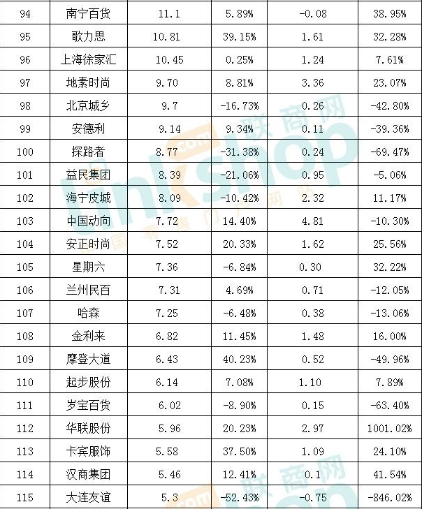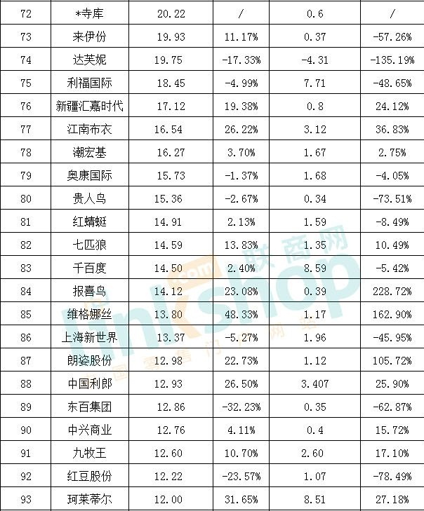 127家零售業上市公司,如果按照公司數量來劃分,百貨與服飾的上市公司數最多,其中,百貨48家,實現營收2230.13億元,凈利潤80.46億元,凈利潤率為3.61%,服飾46家,實現營收1027.16億元,凈利潤150.26億元,凈利潤率為14.63%,兩者合計94家公司,占上市公司總數的74%,營收占比與凈利潤占比分別為29.72%和31.65%。也就是說:7成以上的百貨服飾類上市公司,實現了三成左右的營收與凈利潤。由此讓人感覺,這類上市公司的數量是不是有點多!