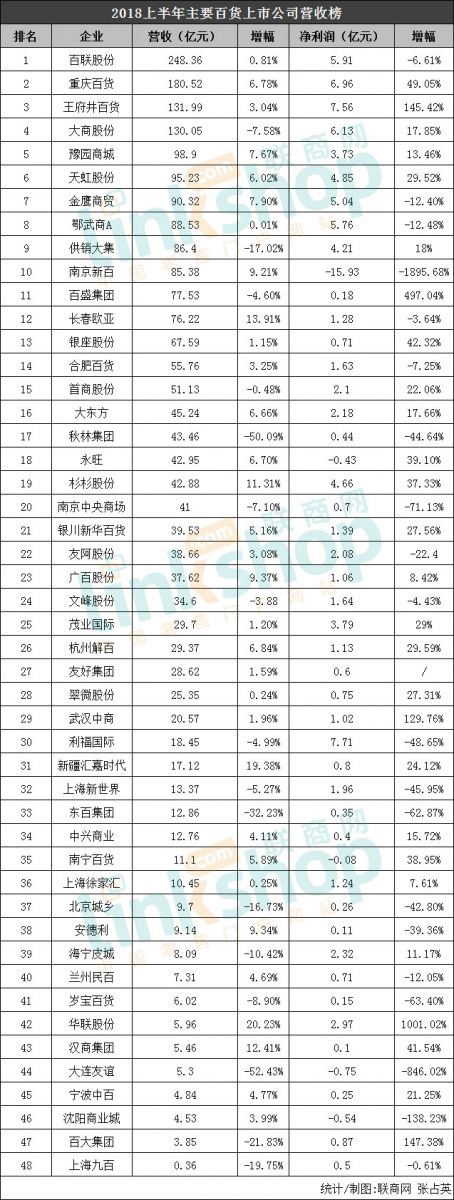 據聯商網統計數據顯示,2018年上半年,我國127家零售業上市公司共實現營收10957.54億元,凈利潤729億元。