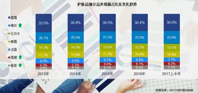 護(hù)膚市場(chǎng)中的細(xì)分品類格局悄然發(fā)生變化,精華、面膜、套裝份額略提升。