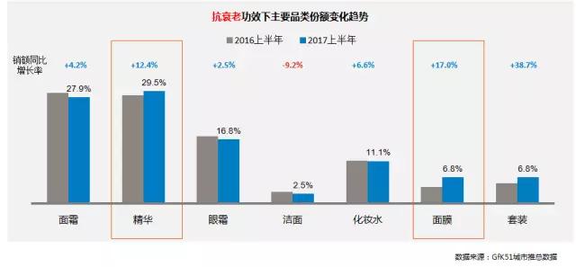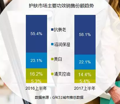 護(hù)膚品的第一重功效中,抗衰老成為消費(fèi)者最關(guān)注的護(hù)膚功效,份額上漲最明顯。數(shù)據(jù)顯示,2017上半年,近六成的產(chǎn)品有抗衰老功效。