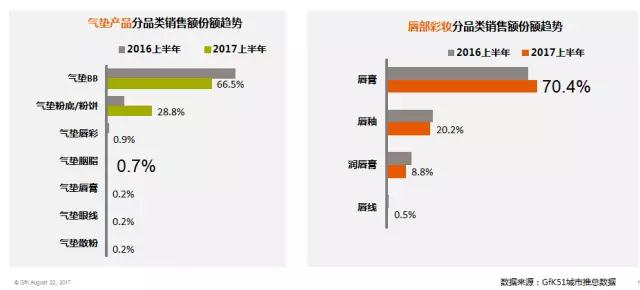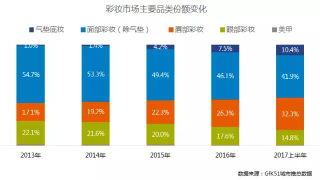 彩妝市場(chǎng)主要品類份額變化趨勢(shì)顯示,氣墊底妝產(chǎn)品份額穩(wěn)步增加,唇部彩妝迎來爆發(fā)時(shí)代。