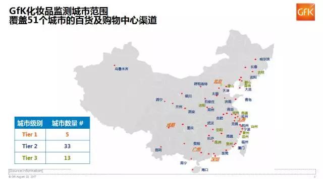 金瀾介紹,幾年前,GfK(捷孚凱市場(chǎng)咨詢)開始進(jìn)行連續(xù)性化妝品監(jiān)測(cè),監(jiān)測(cè)城市范圍覆蓋51個(gè)城市的百貨及購物中心渠道;其中,一線城市為5個(gè)、二線城市33個(gè)、三線城市13個(gè)。