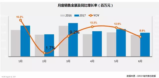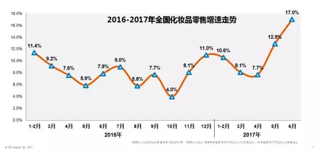 國家統(tǒng)計(jì)局?jǐn)?shù)據(jù)顯示,2017年1-6月份化妝品零售總額為1203億元(限額以上企業(yè)), 同比增長11.3%,化妝品增速高于社會(huì)消費(fèi)品零售總額增速。而根據(jù)GfK監(jiān)測(cè)的51城市傳統(tǒng)百貨+購物中心化妝品規(guī)模走勢(shì)來看,除今年2月增長率僅為1.7%外,上半年的月度銷售金額同比增長率都保持在8%以上,2017年1月更是達(dá)到了16.2%。