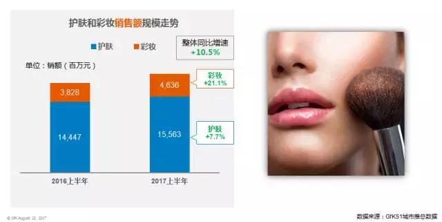 護(hù)膚和彩妝均呈上漲趨勢(shì),其中,彩妝增長速度更明顯。數(shù)據(jù)顯示,2017上半年,所監(jiān)測(cè)區(qū)域護(hù)膚和彩妝整體銷售同比增速達(dá)10.5%;其中,彩妝同比增長21.1%,護(hù)膚同比增長7.7%。