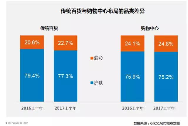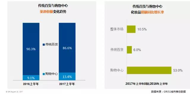 GfK51城市推總數(shù)據(jù)顯示,傳統(tǒng)百貨渠道依然是主力渠道,且在2017年上半年回暖。購物中心渠道的化妝品增速超50%,份額上漲明顯。金瀾表示,目前,購物中心業(yè)態(tài)在大中型城市飛速增長,越多越多的化妝品品牌、零售商也開始選擇在購物中心內(nèi)開店。