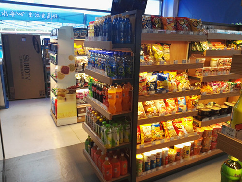 從貨架商品來(lái)看,陳列商品較少,主要以飲料及進(jìn)口食品為主,不過(guò)和易捷便利店商品形成了互補(bǔ)。
