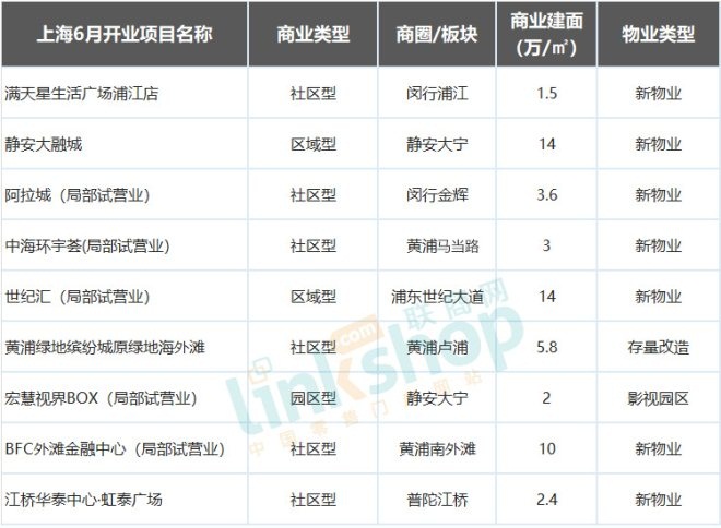 繼5月份長風(fēng)大悅城成為今年首個新開業(yè)的10萬方以上大型購物中心之后,6月10萬平方米的區(qū)域型大型購物中心猛然發(fā)力至3家——靜安大融城、世紀匯及BFC外灘金融中心,其余6家皆為中小型社區(qū)購物中心——滿天星生活廣場浦江店、阿拉城、中海環(huán)宇薈、黃浦綠地繽紛城原綠地海外灘、宏慧視界BOX、江橋華泰中心·虹泰廣場。