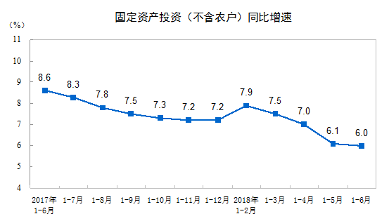 在投資上,2018年1-6月份,全國固定資產投資(不含農戶)297316億元,同比增長6%,增速比1-5月份回落0.1個百分點,與去年同期相比回落2.6個百分點。