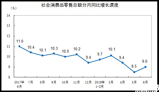 在經歷了2017年的復蘇后,今年社零情況又開始嚴峻起來。據國家統計局數據顯示,6月份我國社零總額為30842億元,同比增長9%,雖比5月的8.5%略有回升,但仍處于今年的低位。