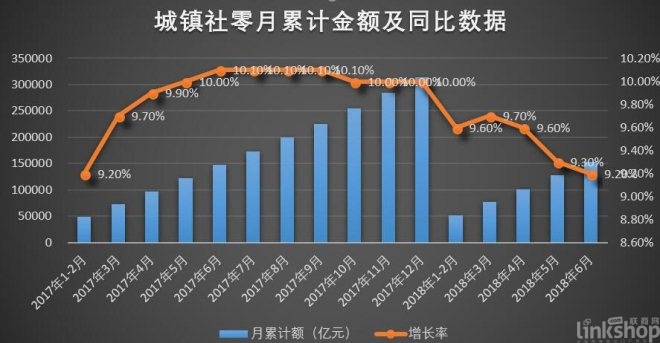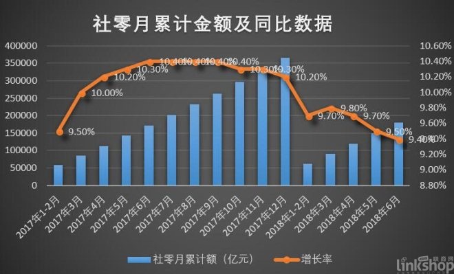 雖然國家統計局數據顯示,1-6月份,我國社會消費品零售總額(以下簡稱社零)為180018億元,同比增長9.4%。但從總體看,上半年整個社會零售環境正逐漸惡化??傮w呈現以下幾個特點: