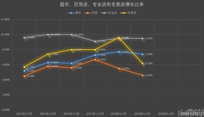 數據顯示,2018年1-6月份,限額以上零售業單位中的超市、專業店零售額同比分別增長7.4%、9.5%?;沮厔萜椒€,而超市方面則從去年一季度到今年一季度一整年呈現不斷上漲的態勢。