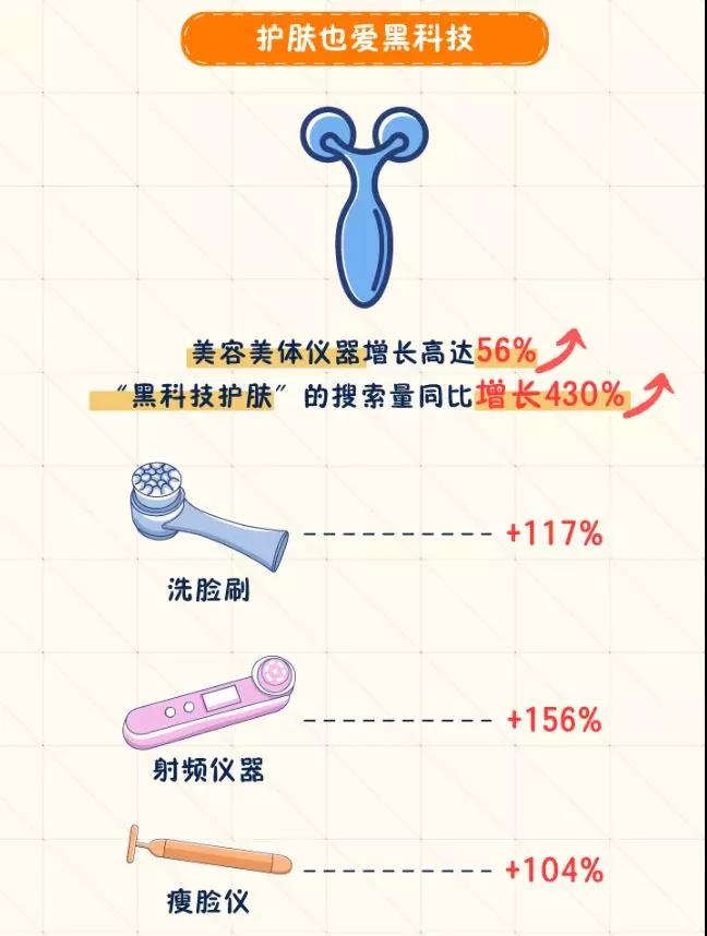 值得注意的是,今年“黑科技護(hù)膚”的搜索量同比增長427.19%,說明科技護(hù)膚是全民的需求。所以,智能美容儀、智能面膜機(jī)、美容配方設(shè)計(jì)器、智能肌膚測試儀等自帶“黑科技”的產(chǎn)品都在搶著上新。