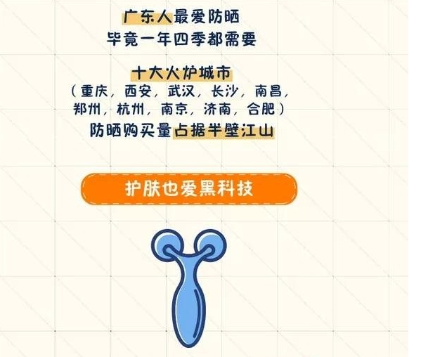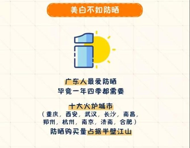 還有,美白不如防曬。白皮書顯示,廣東人最愛防曬,畢竟因?yàn)闅夂蛟颍瑥V東人一年四季“不可一日無此君”;同理,十大火爐城市(重慶、西安、武漢、長沙、南昌、鄭州、杭州、南京、濟(jì)南、合肥)也理所當(dāng)然地占據(jù)了防曬購買量的半壁江山。