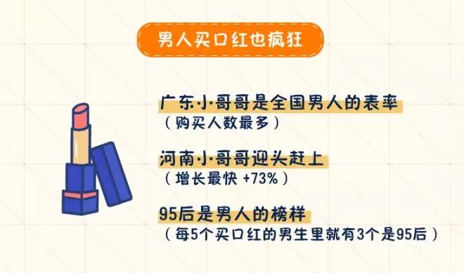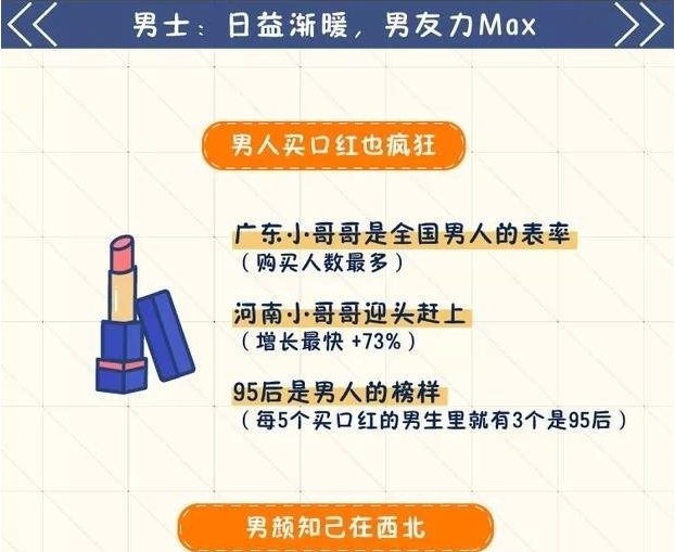 萬萬沒想到,男人買起口紅也一樣瘋狂!其中廣東小哥哥最愛購買口紅,堪稱全國男人之表率;河南小哥哥以73%的增長在后面緊追;而每5個(gè)買口紅的男生里就有3個(gè)是95后,95后真是實(shí)力寵女友!