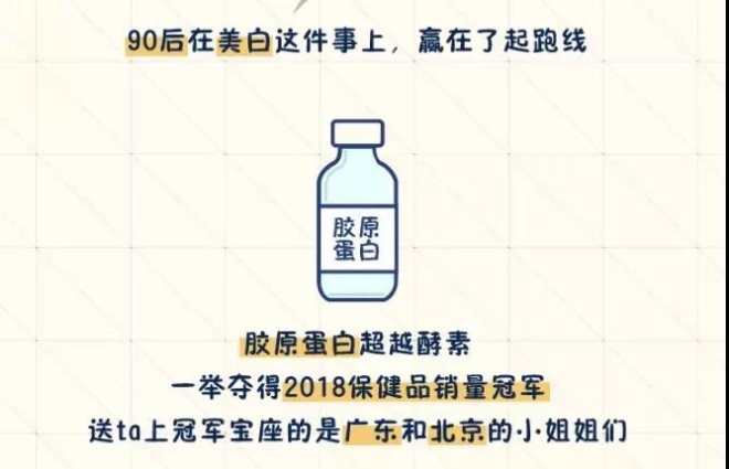 而膠原蛋白也超越了酵素,一舉多得了2018年保健品銷量冠軍,90后尤其喜歡購買這類產(chǎn)品。這也難怪,在美白這件事上,承前啟后、繼往開來的90后當(dāng)然會(huì)贏在起跑線上。