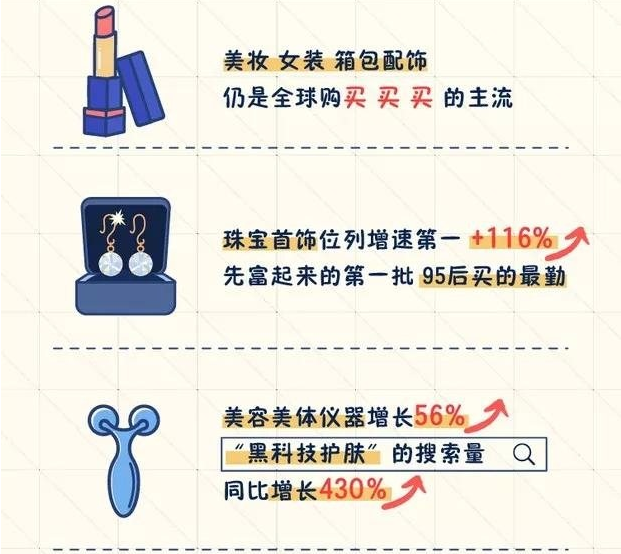 第三,美妝、女裝、箱包配飾仍是全球購買買買的主流。