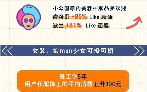 其次是小眾國家表現(xiàn)不俗。摩洛哥的美妝類同比增長85%,最受歡迎的是精油,波蘭的美妝類同比增長81%,最受歡迎的是面膜。誰又能想到泰國美妝增長居然高于日韓?
