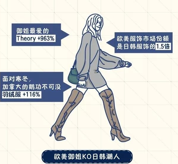 海淘女裝風(fēng)格上,歐美御姐風(fēng)完勝日韓潮人風(fēng)。統(tǒng)計(jì)顯示,今年海淘歐美服飾的市場份額是日韓服飾的1.5倍,其中,御姐最愛的Theory 增長高達(dá)963%。