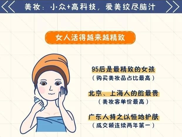 首先,女性消費(fèi)者特別是95后,在購買美妝品上一點(diǎn)都不手軟。其中,北京、上海人花在美妝上的客單價(jià)最高,看來,“帝都”和“魔都”不僅房子貴,臉也是最貴的;而廣東人連續(xù)兩年奪得成交額之冠,喜獲持之以恒護(hù)膚獎(jiǎng),中國第一富省果然名不虛傳。而且,人們的化妝技巧也越來越好,比如說高光同比增長了115%,而隨著女人對美妝的需求越來越旺盛,美妝品類的銷量也讓人嘆為觀止:2018年全球購的面膜的銷量連起來可繞地球5.5圈。