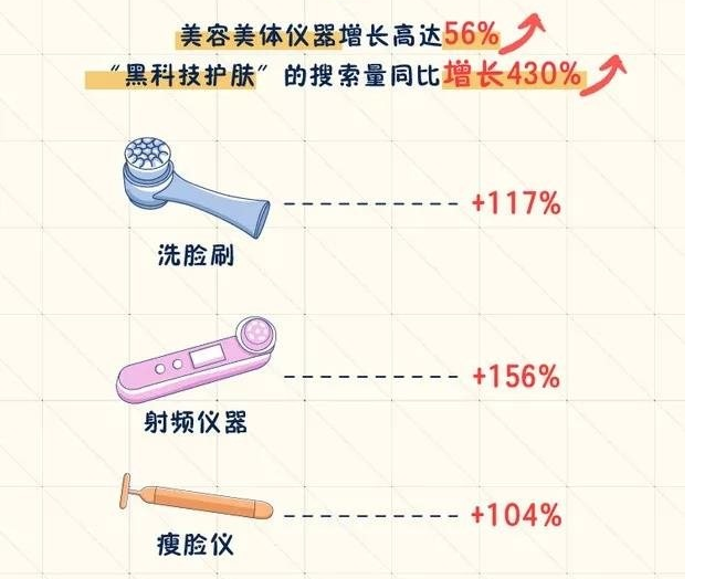 白皮書顯示,今年美容體儀器的增長高達(dá)56%,其中洗臉?biāo)⒃鲩L117%,射頻儀器增長156%,瘦臉儀增長104%,這些產(chǎn)品都自帶科技屬性。