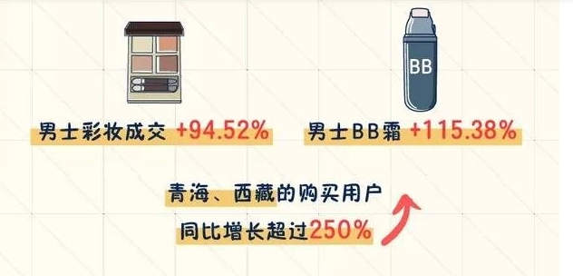 除了口紅外,男人們的最愛還有包包和彩妝。“一言不合就買包包”讓今年男士包袋類購買增長高達(dá)95%;彩妝方面,西北地區(qū)的男士彩妝成交同比增長94.52%,男BB霜同比增長115.38%,青海、西藏的購買用戶同比增長超過250%,原來“男顏知己在西北”啊。