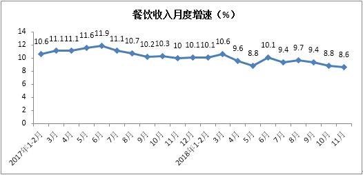 1-11月份,餐飲收入實現38294億元,累計增長9.5%,增速較1-10月份放緩0.1個百分點。其中,11月份餐飲收入同比增長8.6%,增速較上月放緩0.2個百分點。