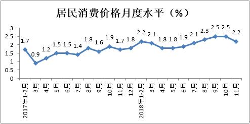 1-11月份,居民消費價格累計上漲2.1%,漲幅較2017年同期提高0.6個百分點。其中食品價格同比上漲1.7%,漲幅較2017年同期加快3.2個百分點;非食品價格同比上漲2.2%,漲幅較同期放緩0.1個百分點。消費品價格同比上漲1.9%,漲幅較同期提高1.2個百分點;服務價格同比上漲2.5%,漲幅較上年同期放緩0.5個百分點。
