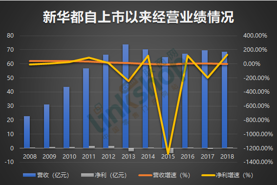 新華都自上市以來經(jīng)營業(yè)績情況,數(shù)據(jù)來源:公司財報,聯(lián)商網(wǎng)