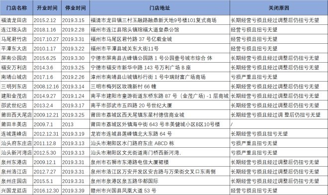 5月5日晚間,新華都發(fā)布《關于關閉處置部分門店暨風險提示的公告》,公告顯示,公司一季度關閉門店達到19家,其中福建區(qū)域18家,江西區(qū)域1家。關閉門店中,經營年限最長的已經超過10年,而最短的僅僅一年左右。關閉原因主要是長期虧損并扭虧無望。