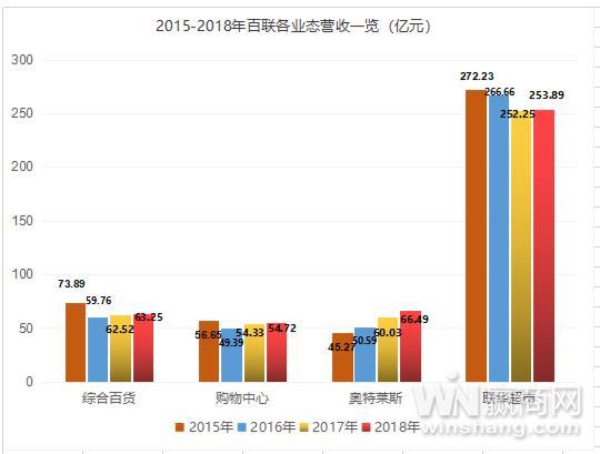 2018年?duì)I收整體上揚(yáng)背景下,百聯(lián)旗下各業(yè)務(wù)版塊營(yíng)收也實(shí)現(xiàn)全線飄紅。具體從百貨、購物中心、奧特萊斯、聯(lián)華超市4大業(yè)務(wù)板塊來看,贏商網(wǎng)注意到,其中綜合百貨2018年實(shí)現(xiàn)營(yíng)收63.25億,聯(lián)華超市營(yíng)收達(dá)253.89億,雖相較于2015年?duì)I收分別縮水14%、18%,但卻是四年來首次增長(zhǎng);奧特萊斯的營(yíng)收增長(zhǎng)勢(shì)頭明顯,較2015年大增47%%至66.49億元,購物中心持續(xù)回升至54.72億。