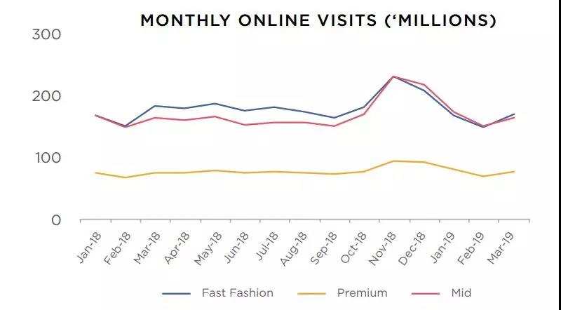 快時尚:該領(lǐng)域大多數(shù)玩家的流量下降導(dǎo)致了2019年第一季度的訪問量呈負(fù)增長.