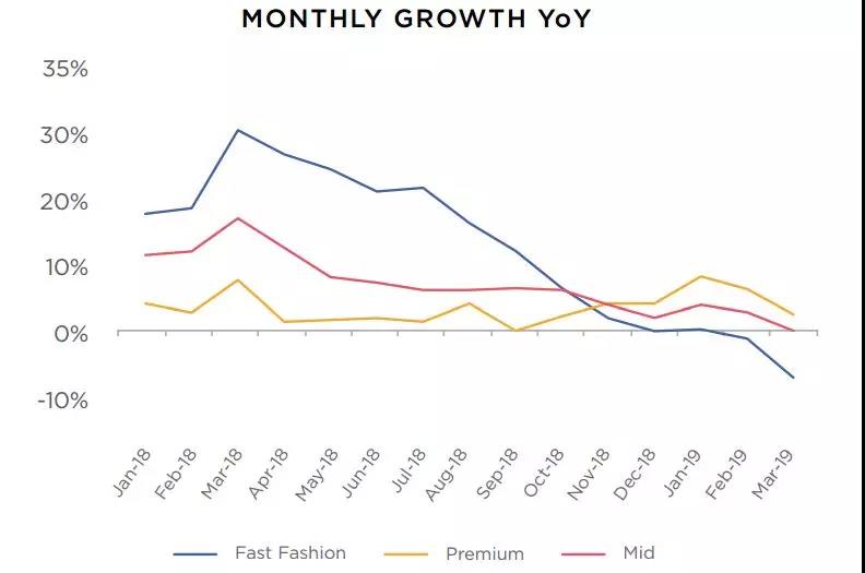 2019年初,各時尚階層 (快時尚、中端時尚和高端時尚) 的在線訪問量增速均有所放緩。