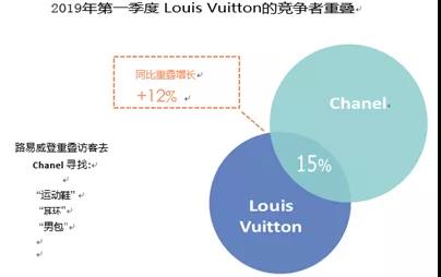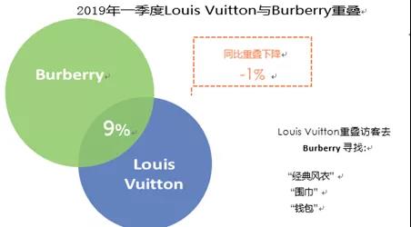 以路易威登Louis Vuitton為例:在2019年第一季度,Louis Vuitton與Burberry的訪客重疊率為9%,但同比下降了1%。Louis Vuitton與Chanel的訪客重疊率較高,為15%,同比增長12%。