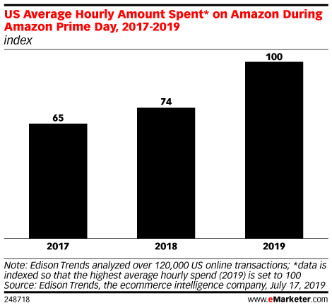 創紀錄的會員日銷售不僅僅是從去年的36小時活動延長到今年的48小時的結果。電子商務情報公司Edison Trends分析了12萬筆會員日在線交易,發現今年美國亞馬遜客戶的平均每小時支出比2018年會員日高出35%,比2017年會員日高出55%。即如果把今年每小時支出設定為100,則去年為74,2017年僅為65。