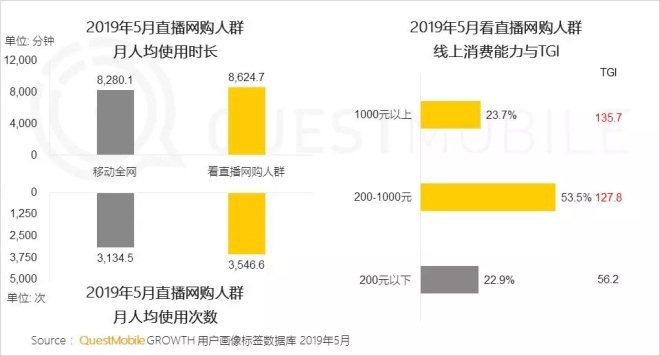 實際上,電商直播的帶貨能力不言而喻。QuestMobile發布的《2019年“6.18”電商大報告》顯示,直播網購用戶群體的人均使用時長和次數,均高于移動電商全網大盤數據。值得一提的是,接近8成的直播網購用戶消費能力達到中高水平,體現出強勁的購買力。