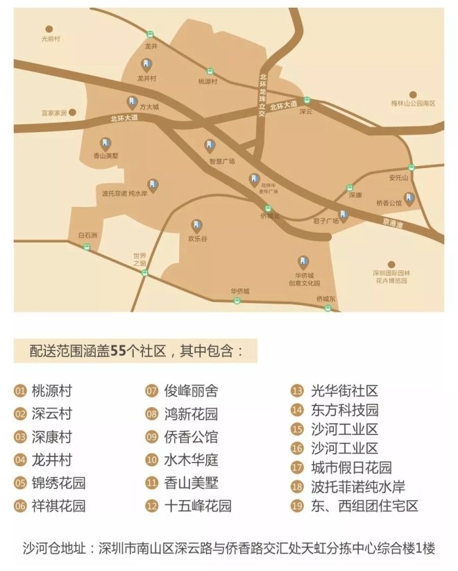 北至龍井村南至僑城東,東至安托山西至沙河東路,僑香、深康、深云、桃源、龍井......通通都在沙河倉天虹到家配送范圍