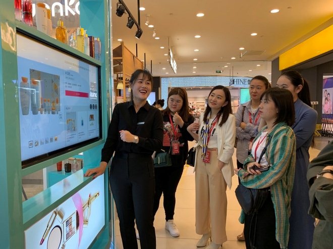 在合肥政務區銀泰城的云店內,導購員熟悉的在屏幕前替顧客查找其所需要的美妝產品,以雪花秀一款禮盒為例,原價840元的禮盒杭州西湖銀泰城僅售588元,“這時候就會推薦顧客下單,從西湖銀泰城發貨,我這里能看到銀泰65家商場所有的活動,在從中找出最優的價格推薦給顧客。”