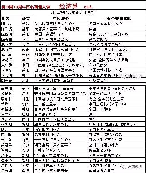 據(jù)了解,為更好地學(xué)習(xí)貫徹習(xí)近平同志新時代關(guān)于“崇尚英雄模范,爭做先鋒榜樣”的指示精神,全面宣傳推介海內(nèi)外各界優(yōu)秀湖湘人物,樹立新時代湖湘榜樣典范,大力弘揚(yáng)“胸懷天下、敢為人先、勇于擔(dān)當(dāng)”的湖湘精神,本次評審以新中國70周年為契機(jī),于今年5月份發(fā)起“尋找共和國70年湖湘人物”活動,并將入選的161位海內(nèi)外各界湖湘代表名單按照教育、科技、經(jīng)濟(jì)、文體衛(wèi)、公益慈善等五大領(lǐng)域分類,由高分到低分評選出了“新中國70周年百名湖湘人物”榜單。